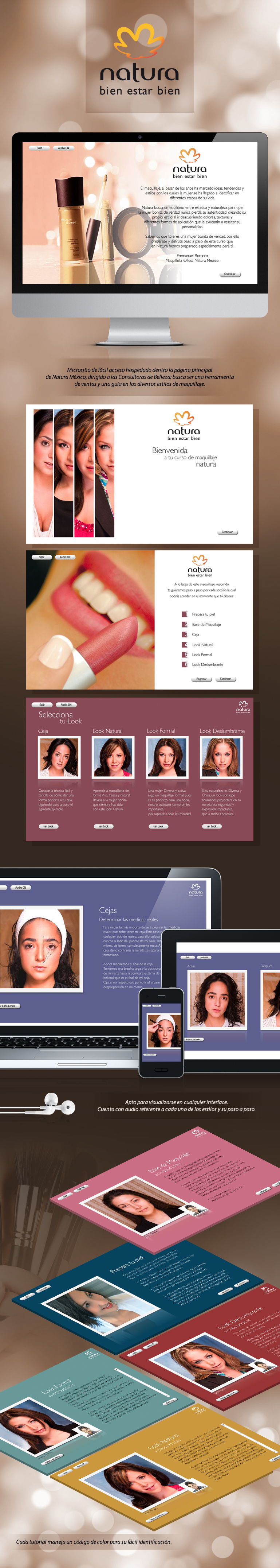 Diseño y desarrollo de CD interactivo de curso de maquillaje para Natura México, el objetivo de este proyecto fue mostrar las técnicas de maquillaje y preparación de piel con productos Natura cosméticos, posteriormente este proyecto creció hasta su publicación en red dando acceso a cualquier usuario mediante un formulario de registro.