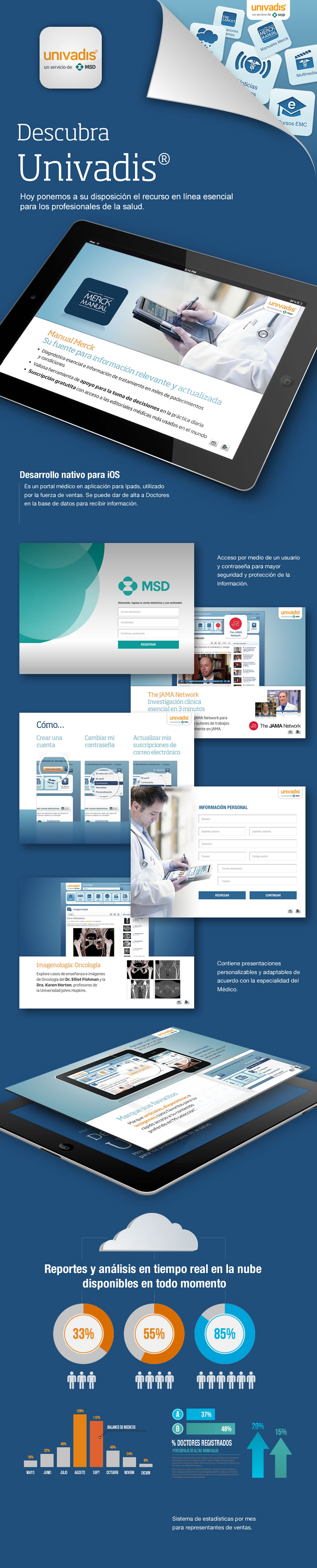 Desarrollo de la aplicación Univadis-MSD para el uso de representantes médicos. La aplicación fue desarrollada de forma nativa en IOS para iPads. Esta herramienta ha sido de gran impacto para los representantes médicos.